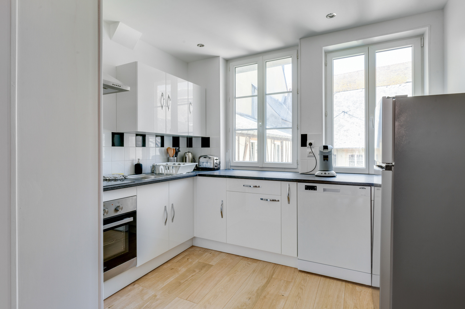 La cuisine ouverte est équipée d'électroménagers modernes de bonne qualité.