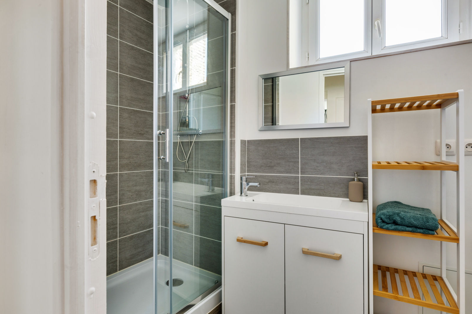.Le couloir dessert une salle d'eau comprenant une douche ainsi qu'un joli meuble de rangements.